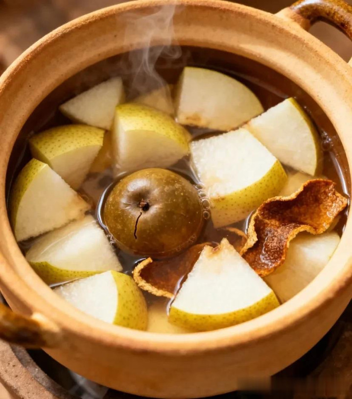 小贴士:适合口干咽痛、咳黄稠痰的情况,雪梨带皮煮遵守更好,罗汉果别放太多以免过甜。