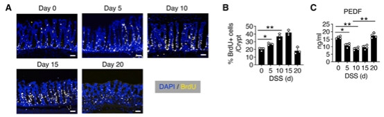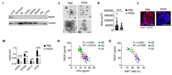 此外,商讨还发现,在 IBD 患者急性发作工夫,LPS 水平升高,肠上皮细胞(IEC)的增殖加多。这些发现强调了 PEDF 在东说念主类肠说念疾病,相配是在 IBD 发展经由中的蹙迫作用,PEDF 水平的镌汰偏激对 ISC 增殖的扼制作用。
