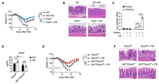 这一假定进一步被考据:在败落 PEDF 的小鼠中,FB 未能加重肠炎。此外,PPARα 增强了 FB 对 Pedf 抒发的促进作用。FB 惩处普及了平淡小鼠的 PEDF 水平,但在清寒 PPARα 的 AlbcrePparafl/fl 小鼠中莫得这种后果,说明 PPARα 的存在关于 FB 加多 PEDF 水平至关蹙迫,PPARα 的缺失使得小鼠对 DSS 引起的结肠炎愈加明锐。
