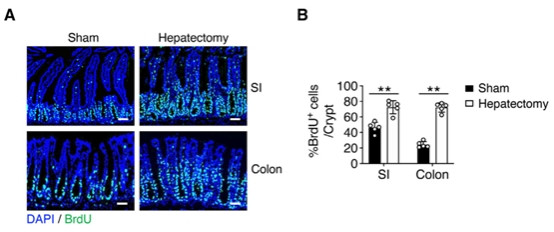 商讨东说念主员对野生型 C57BL/6 小鼠进行了肝切除手术,在术后第三天不雅察到小鼠小肠和结肠隐窝中上皮细胞增殖显赫加多,这标明 肝脏源性因子可能扼制肠说念干细胞(Intestinal Stem Cells, ISC)的增殖。