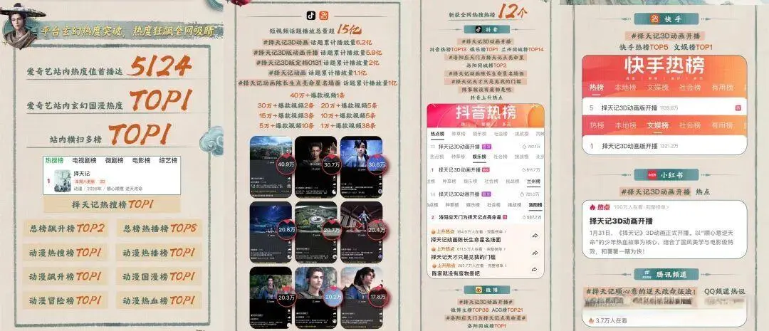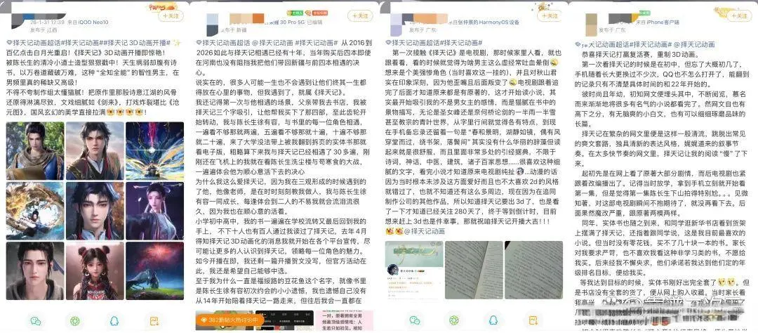 作品与不雅众的双向奔赴,在《择天记》这里体现得长篇大论。网友们纷繁在酬酢平台回忆与这个IP瓦解的过往:“2016到2026,再会十年”“爱择天记,因为我也在兴隆意的辞世”;看完动画后,粉丝们更是不惜陈赞,直言制作组“太懂猫腻”“太懂情感”。看成原作点击量破百亿的演义“白蟾光”,《择天记》3D动画的重启也收成了无数认同:“恭喜打赢回生赛,重制3D动画太可了”“终于比及,赶上3D亦然件幸事”。凭借这份口碑加持,《择天记》开播时辰斩获全网热搜12个,短视频话题播放总量超15亿,批驳区盖楼热聊不休,热度持续发酵。
