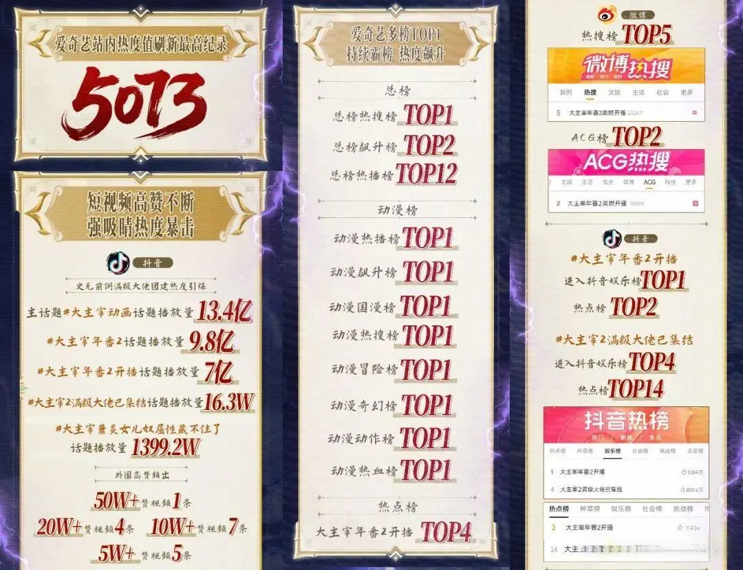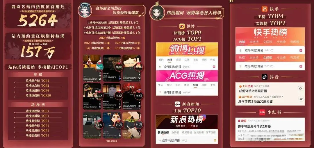 《成何体统 第2季》惊喜回想,开播前站内预约东说念主数便突破150万,首播仅5小时就碎裂爱奇艺好处动漫飙升记载,热度值高达5264,横扫站内总榜、动漫榜等多个榜单TOP1,同期强势登陆微博、抖音、快手、小红书等多平台热榜,势头迅猛。