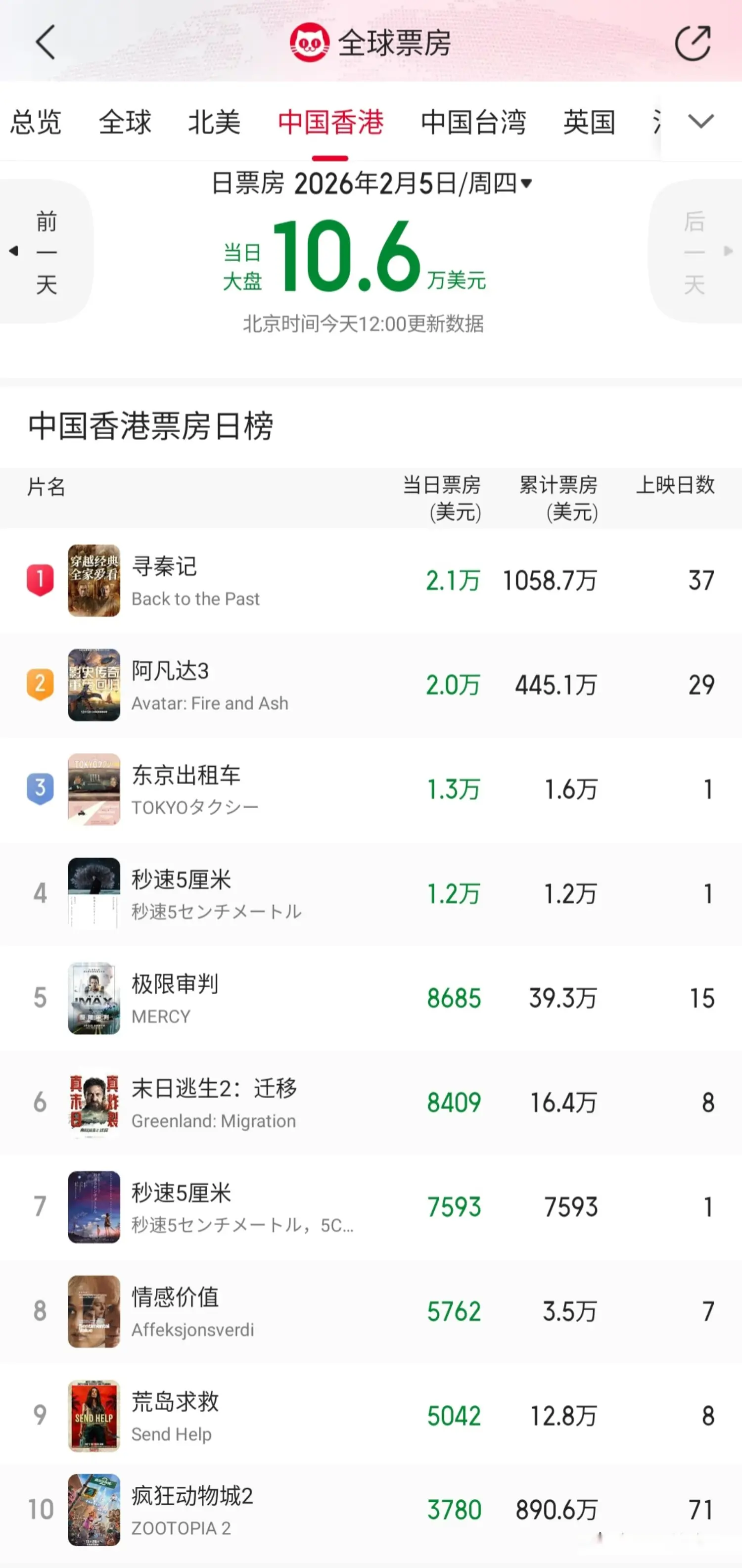 2026年2月5日(周四)中国香港票房统计;
