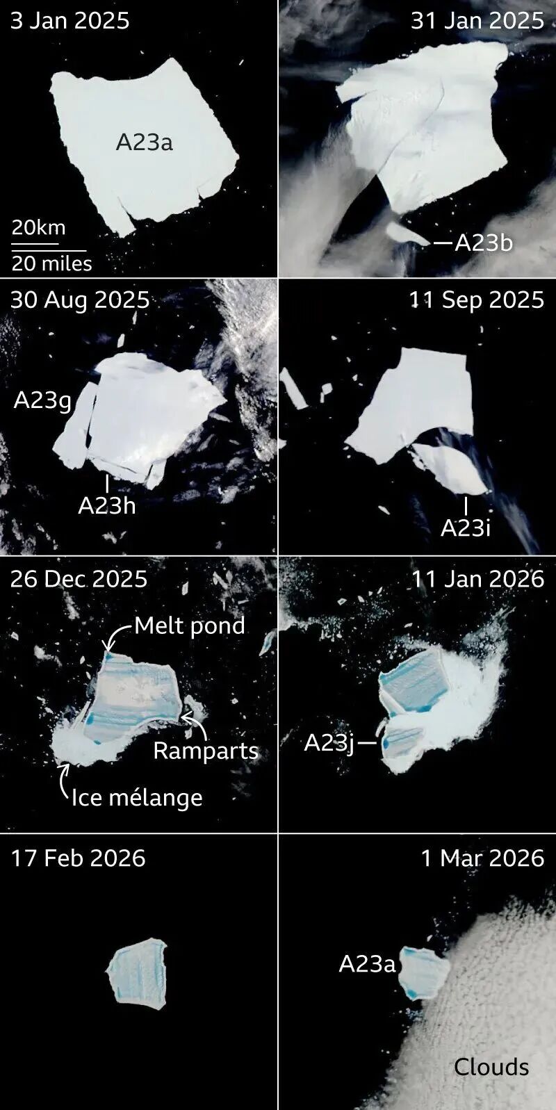 2025年6月至9月,A23a发生屡次大畛域断裂,面积连忙缩减至约1400平时公里。
