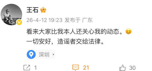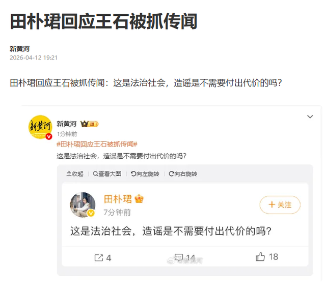 4月12日,网传万科独创东说念主王石被执音讯激发网友热议。傍晚,王石浑家@田朴珺发文辟谣,“这是法治社会,责怪是不需要付出代价的吗?”