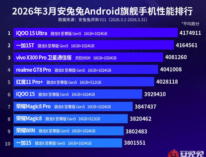 现时的手机性能越来越强了,强到也曾有条记本也启动搭载手机芯片了,比如苹果全新发布的MacBookNeo搭载的便是A18Pro芯片。这种跨界会通记号着转移端算力果决多余,足以重塑出产力用具。而关于安卓阵营,性能每年的栽植速率致使要比苹果大不少,,把柄安兔兔公布的手机性能榜单,现时手机性能梯队的“三剑客”当属iQOO15Ultra、一加15T以及vivoX300Pro。这三款机器不仅是单纯的堆料,更是针对电竞、小屏和影像三个细分赛谈的极致探索,代表了现时安卓工业规画的最高水准。