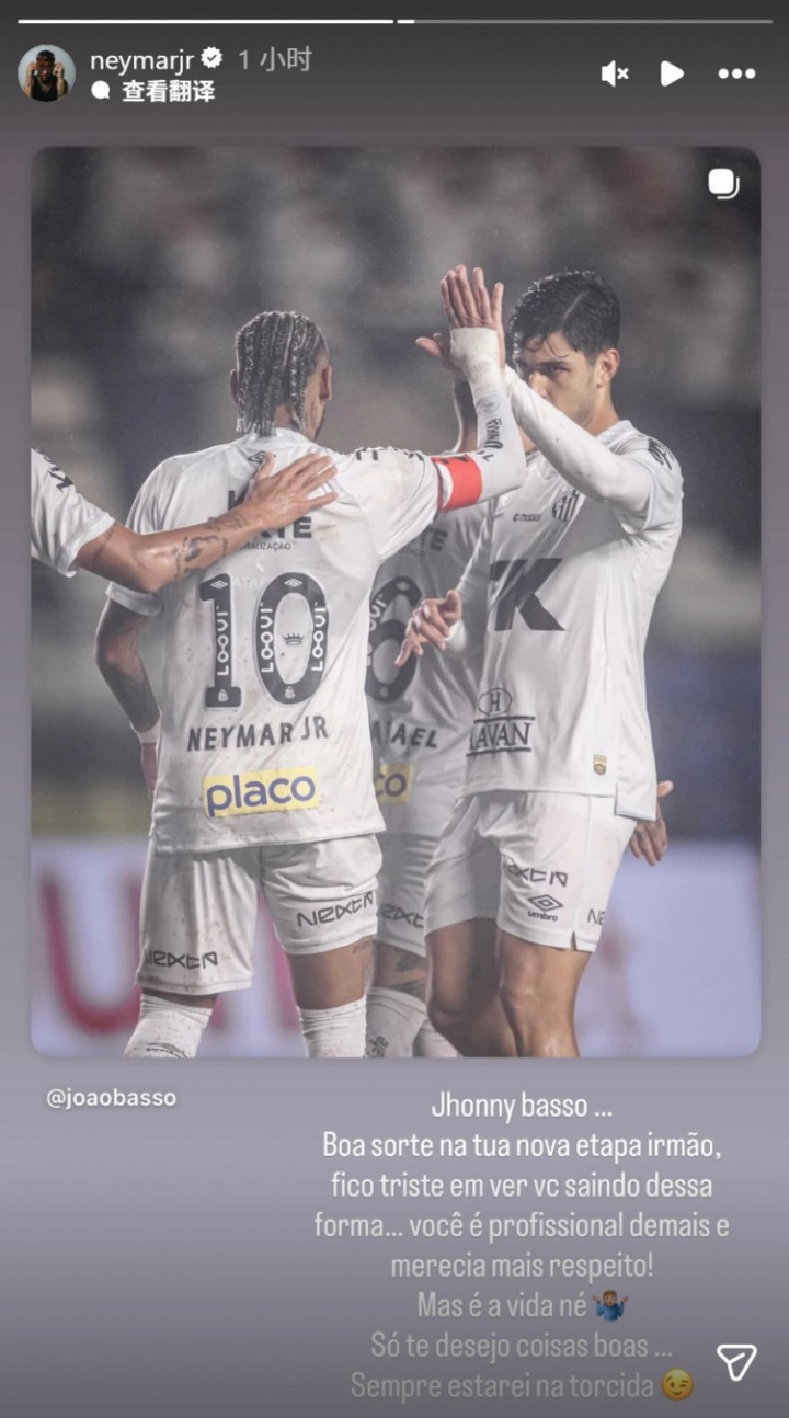 直播吧3月5日讯内马尔更新社媒动态,与桑托斯解约球员若昂·巴索告别。